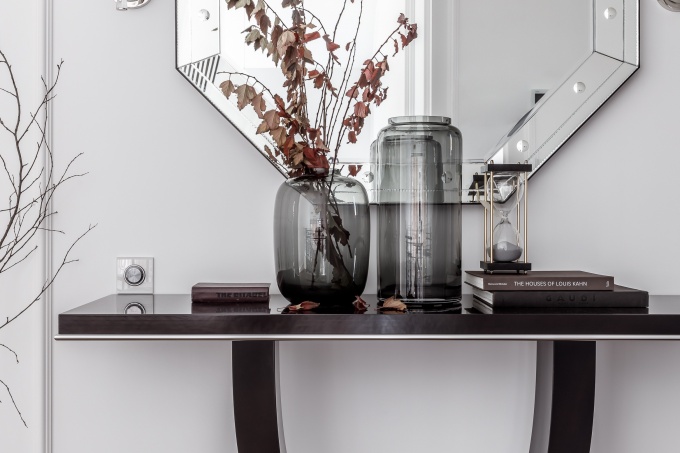 «Квартира имеет большую глубину, и ряд помещений из-за такой оконной сетки остаются совсем без естественного освещения, - отмечает дизайнер. – Поэтому нашей главной задачей было максимально раскрыть пространство, дать больше воздуха, избавиться от «слепых» зон. Отсюда и анфиладная планировка, и светлая палитра, и разнообразные декоративные приемы-обманки, которые позволяют играть с объемом». Заказчики любят современный французский стиль, они хотели минималистичный, но элегантный интерьер в духе изысканных парижских салонов.