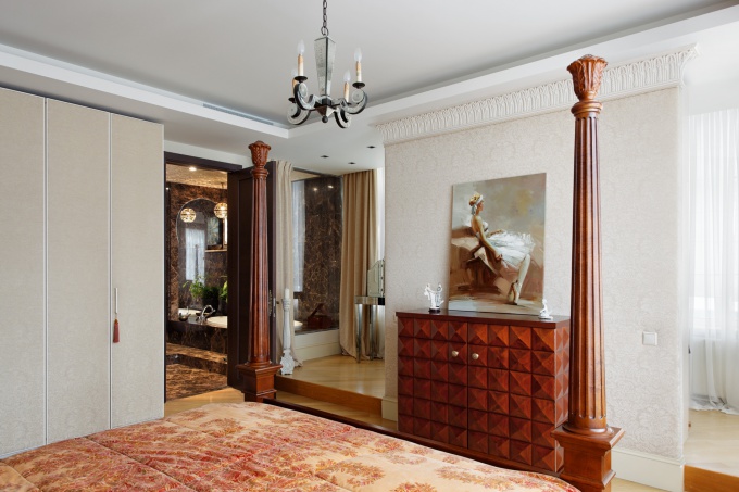 В современных интерьерах зонирование осуществляют с помощью простенков или раздвижных перегородок. Их чаще применяют в небольших посещениях, где нет дополнительного пространства для отдельной гардеробной. Можно использовать и ширму – она мобильна и легко трансформируется.