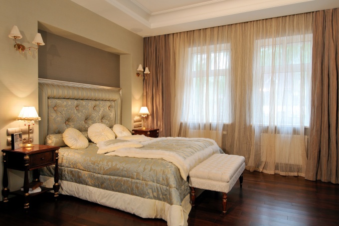 В спальне особую роль играет текстильное оформление окон. Обычно используют два вида штор. Ближние к окну – «ночные шторы». Они могут быть светонепроницаемы, тогда используют ткань black out. Можно ограничиться и плотной тканью на подкладке. У таких штор есть еще одна полезная функция – звукопоглощение.