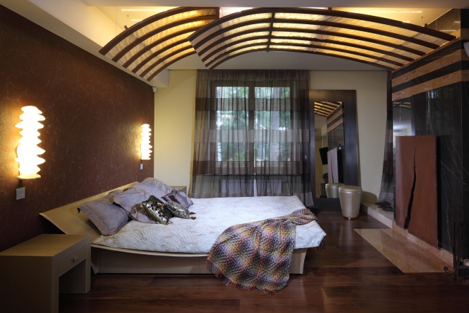 В спальне особую роль играет текстильное оформление окон. Обычно используют два вида штор. Ближние к окну – «ночные шторы». Они могут быть светонепроницаемы, тогда используют ткань black out. Можно ограничиться и плотной тканью на подкладке. У таких штор есть еще одна полезная функция – звукопоглощение.