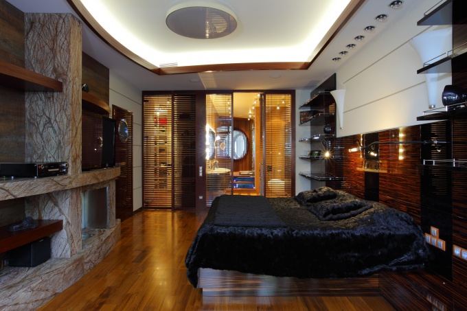 Для увлеченных яхтенным спортом заказчиков архитекторы спроектировали квартиру в стиле роскошной яхты. В ее оформлении они использовали весь арсенал средств, подчеркивающих стилистику квартиры: роскошное полированное красное дерево, окна-иллюминаторы, хромированные детали и декоративные элементы с морской символикой.