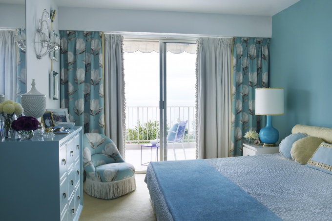 Ключом к декоративному решению задачи стал обрез льняной ткани от Schumacher со стилизованными цветами на голубом фоне. К нему он подобрал обивку с геометрическим рисунком, обои и серо-голубые оттенки для стен.