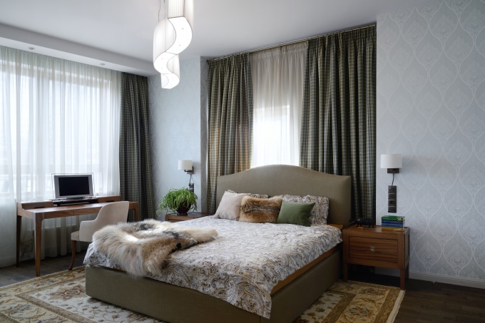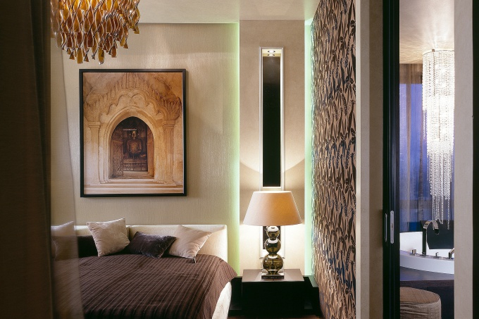 Главное, что отличает спальню – особый уют. Шторы, обои, свет – все это очень важно. Здесь вполне подойдет контурная, «затухающая» подсветка. Следует следить за устройством света, расположенного за спинкой кровати, он не должен мешать спящему, когда другой читает.