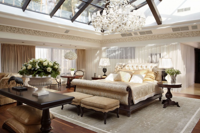 Роскошный дом со спальней под световым фонарем. Светлый, наполненный солнечными лучами и позитивный интерьер с интеллигентной атмосферой, пышными отделками и хорошей дрогой мебелью.