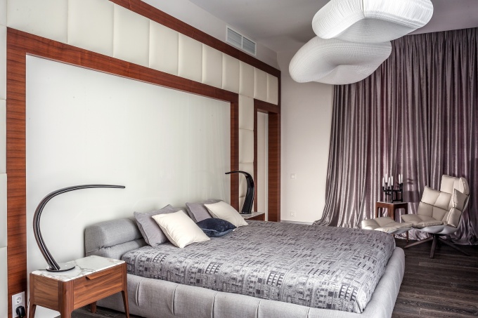 Всегда режиссирую свет: от входа включаем освещение нескольких камерных зон, у кровати выключаем. Люблю разнообразие – верхний свет, торшер, настольные лампы у кровати. Кстати, читать под ними не удобно, независимо от их высоты. Поэтому всегда устанавливаю бра над кроватью, причем вешаю его на определенной высоте – 140-150 см от пола, в зависимости от высоты спинки кровати и роста заказчика.