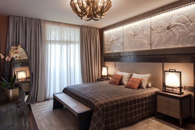 В спальне особую роль играет текстильное оформление окон. Обычно используют два вида штор. Ближние к окну – «ночные шторы». Они могут быть светонепроницаемы, тогда используют ткань black out. Можно ограничиться и плотной тканью на подкладке. У таких штор есть еще одна полезная функция – звукопоглощение.