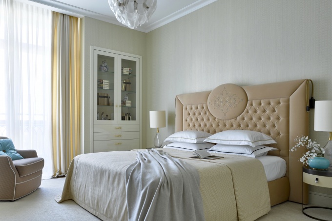 Всегда режиссирую свет: от входа включаем освещение нескольких камерных зон, у кровати выключаем. Люблю разнообразие – верхний свет, торшер, настольные лампы у кровати. Кстати, читать под ними не удобно, независимо от их высоты. Поэтому всегда устанавливаю бра над кроватью, причем вешаю его на определенной высоте – 140-150 см от пола, в зависимости от высоты спинки кровати и роста заказчика.