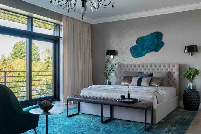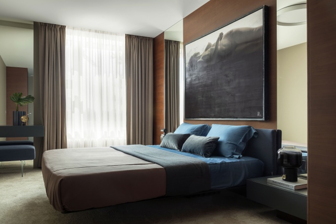 В спальне особую роль играет текстильное оформление окон. Обычно используют два вида штор. Ближние к окну – «ночные шторы». Они могут быть светонепроницаемы, тогда используют ткань black out. Можно ограничиться и плотной тканью на подкладке. У таких штор есть еще одна полезная функция – звукопоглощение.