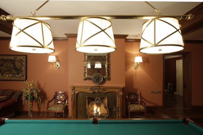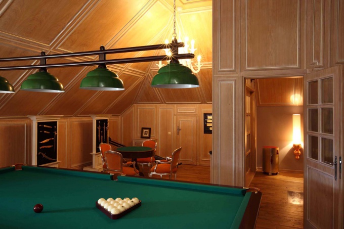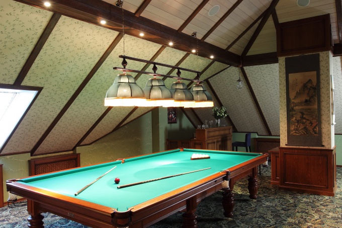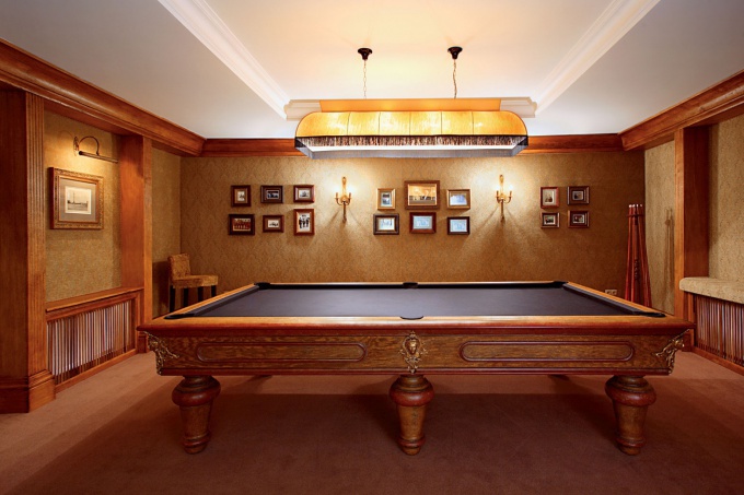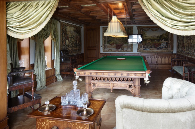 Темные панели, закрывающие стены, потолки из бруса, паркетные полы – обилие дерева позволит привнести в дизайн бильярдной в английском стиле атмосферу тепла, естественного благородства, добротности. Разбавить подобный интерьер позволят большие картины, тяжелые портьеры с ламбрекенами. В качестве обстановки используется массивная мебель, украшенная ручной резьбой. Комфортная бильярдная может служить не только местом для благородной игры, но и своеобразным совещательным залом, где можно в спокойной атмосфере обсудить интересующие вопросы.
