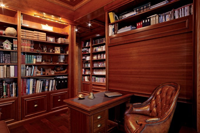 Домашний кабинет – это особое помещение в доме. Здесь его обладатель может плодотворно поработать в спокойной обстановке или уединиться за чтением любимой книги. Нередко в этой комнате принимают деловых гостей. Респектабельный кабинет в английском стиле обладает благоприятной для работы атмосферой и подчеркивает высокий статус хозяина дома.
