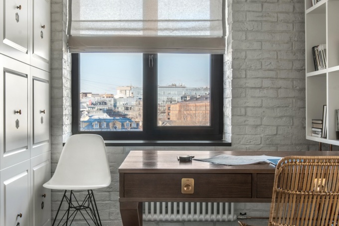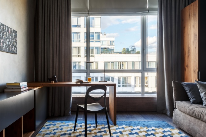 Для ценителей индустриального дизайна дизайнер Оксана Храмова оформила квартиру с видом на высотку МГУ, сделав парадную сталинскую архитектуру частью внутреннего пространства. У заказчиков есть семейное жилье, им нужна была квартира, куда можно прийти поработать вне офиса, провести деловую встречу или мозговой штурм с коллегами, отдохнуть в свободной обстановке.
