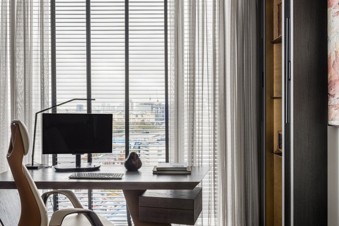 «Новую квартиру заказчик видел как комфортную «пещеру» с затемненным пространством, где приятно отдыхать после трудовых будней. Так как квартира достаточно глубокая, нам удалось гармонично соединить панорамное остекление и приватную атмосферу с нотой романтики», - отмечает дизайнер.