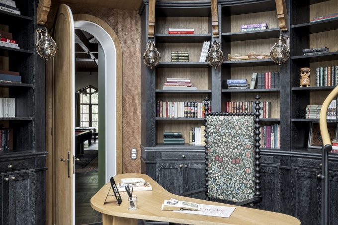 Чтобы не спорить с природой, дом решили построить одноэтажный, но с огромными окнами. Дизайнер признается, что на необычную форму оконных рам, ее вдохновил собственный дом Константина Мельникова в арбатских переулках. Но пытливый глаз найдет в интерьере оммажи и другим великим: от Фрэнка Ллойда Райта до Антонио Гауди и Уильма Моррриса.