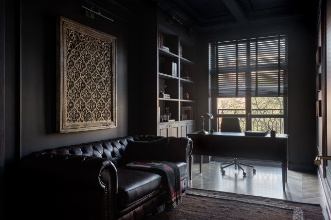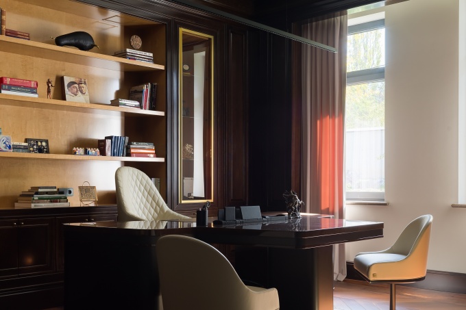В идее создания интерьера кабинета заложены и психологические задачи, обусловленные характером и особенностями заказчика. Самым комфортным расположением за столом считается посадка, при которой человек располагается спиной к стене и имеет возможность обозревать весь объем кабинета.