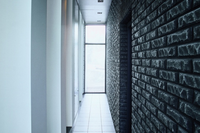 Примечательно, что интерьер коридора в авангардном стиле в настоящее время получил большое распространение. Это выбор людей современных, динамичных, ценящих собственное время и комфорт. Философия решения предполагает присутствие двух контрастных тонов функционально делит узкий коридор на две части – белая, определяющая детскую сторону и стену из черного фасадного камня «под кирпич» – родительскую. Обилие света из окна в конце коридора подчеркивает сочетание плитки пола с потолочными панелями в серых тонах.