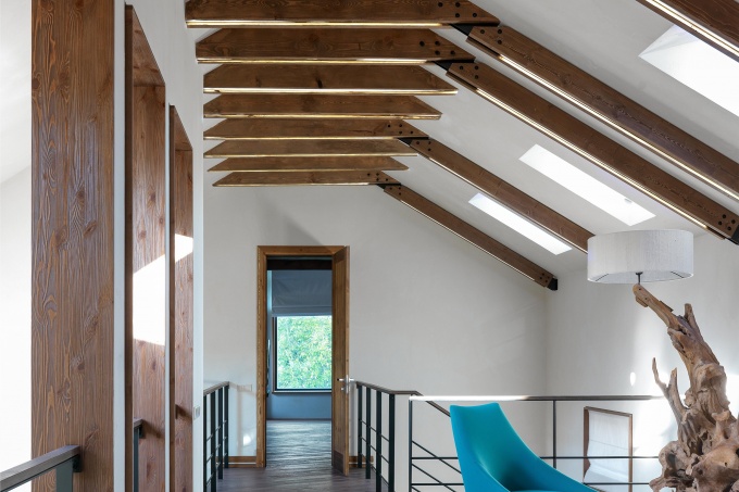Тему оформления во многом диктовала сама архитектура дома: двухскатная кровля, высокий второй этаж, ограждения балконом, импосты окон. Архитекторы предложили увеличить площадь верхнего уровня, надстроить антресоль, для чего разобрали внутреннюю обшивку и обнаружили замечательные гнутые балки бионической формы.