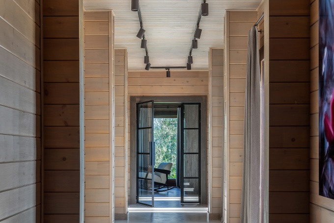 В работу ей досталась одноэтажная постройка из клееного бруса. Особенность архитектуры дома – сочетание закрытого центрального фасада и максимально ориентированной на природу внутренней части, что создает баланс приватности и единения с природой.