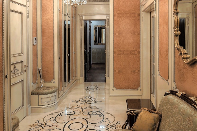 Элитные отделочные материалы – еще одна важная составляющая, без которой коридоры в классическом стиле представить невозможно. Для пола предпочтителен мрамор или дерево. Это дорогостоящая отделка, однако, результат оправдывает все вложения. Как вариант, можно использовать имитацию натурального камня или ламинат. Современные материалы настолько совершенны, что порой только истинный знаток может отличить натуральный камень от его искусственного аналога, применяемого для интерьерной отделки.