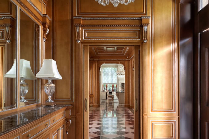 При подборе основного тона отделки стен учитывается и его сочетаемость с декоративными элементами, применяемыми для украшения интерьера.Современный дизайн коридоров в классическом стиле не исключает использование лепнины и позолоченных элементов. Их присутствие добавляет роскошь и благородство. Однако чувство меры при этом подводить не должно.