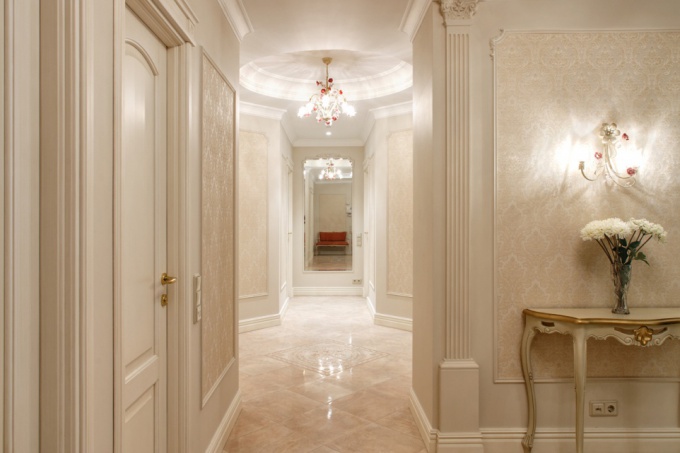 Авторам проекта следовало создать парадный интерьер в классическом стиле. Заказчики видели свое новое жилье респектабельным и комфортным. Чтобы соединить внешнюю нарядность и домашний уют, дизайнеры предложили торжественную классику и беспроигрышную бежево-золотую палитру.