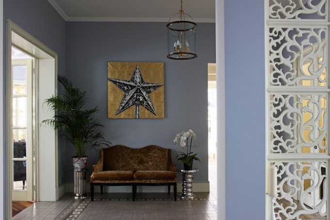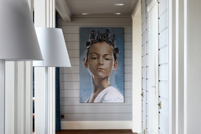Дизайнер Яна Светлова оформила дом молодой семейной пары, влюбленной в путешествия и современное искусство. Дом достался заказчикам в почти готовом виде, основным пожеланием стало создание интересного пространства, спокойного и дружелюбного, очаровывающего неброской роскошью. Дизайнер взяла за основу природную палитру (оттенки серо-голубого неба), добавила к ним яркие цветовые акценты и аксессуары, а также предметы современного искусства.