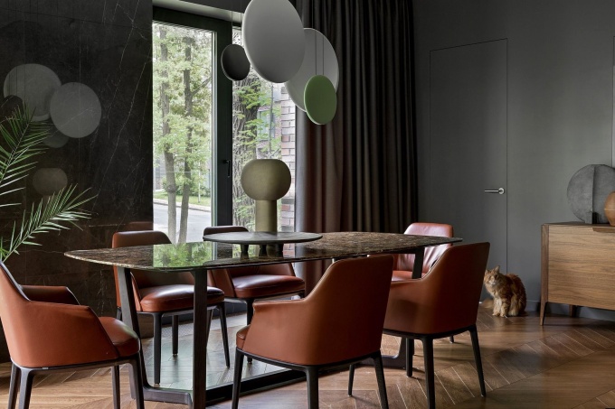 Заказчики не любят белые интерьеры и обратились с пожеланием создать квартиру в плотной коричнево-черной палитре. Благодаря панорамному остеклению и видам на лес монохромный интерьер не выглядит чрезмерно брутальным, от сезона к сезону он наполняется разнообразными природными красками.