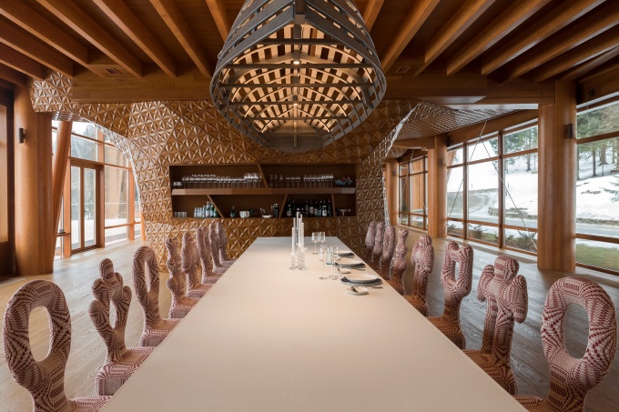 Поскольку следовало учитывать рельеф местности и максимально сохранить существующую растительность, главным принципом работы архитекторов было «не навреди». Так возникла сложная композиция из четырех основных домов: хозяйского, гостевого, спа-комплекса и павильона охраны, которые связаны между собой кровлями, мостами и переходами. Здания возведены из клееного бруса, в отделке фасадов использованы панели из цинк-титана и меди.