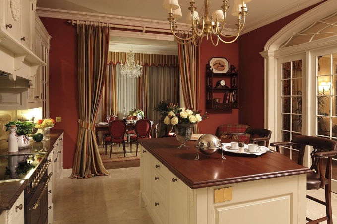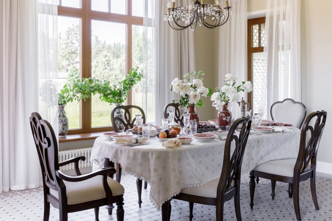 Массивные шторы отлично подойдут помещению в темных тонах. Тем не менее, если интерьер имеет бежевые, серые или голубые оттенки – желательно подобрать более легкие портьеры, а в светлое время суток оставлять закрытыми только гардины. Нередко столовая в английском стиле разрабатывается в духе викторианской эпохи. Из основных нюансов такого оформления можно выделить многоуровневые потолки с симметричными украшениями. Вдоль карнизов допускается выполнение художественной росписи, создание яркой лепнины, а также обустройство ниш с элементами подсветки.