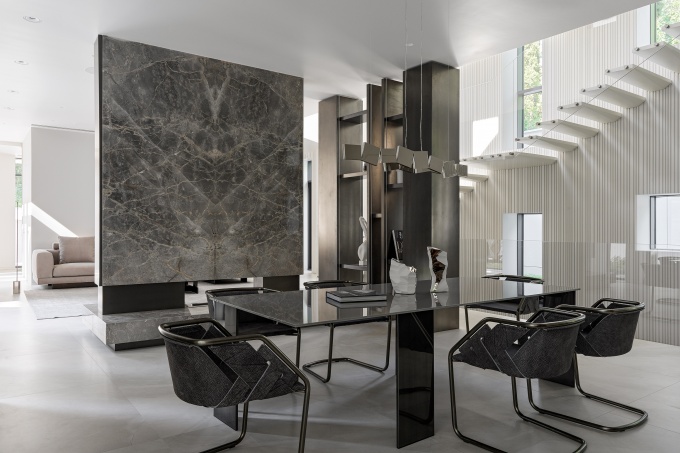 Первый этаж визуально проницаем и открыт, в отделке фасада используются стекло и сатинированная нержавеющая сталь, позволяющие растворить его в окружающем ландшафте и наполнить отраженным светом сад.