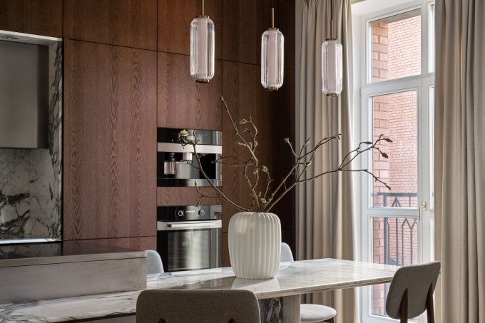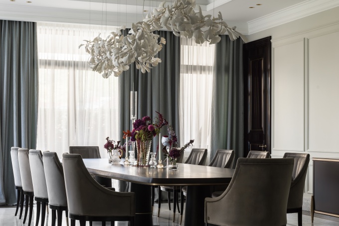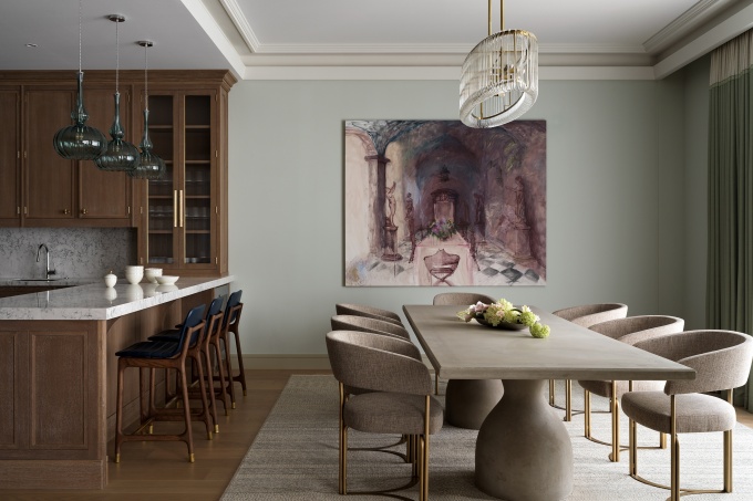 Одной из устойчивых тенденций последнего времени стал отказ от столовой как отдельного помещения в пространстве квартиры. Заказчики организуют столовые в основном в загородных резиденциях, где проектирование этого помещения происходит заранее с учетом необходимых конкретному заказчику параметров этой зоны.