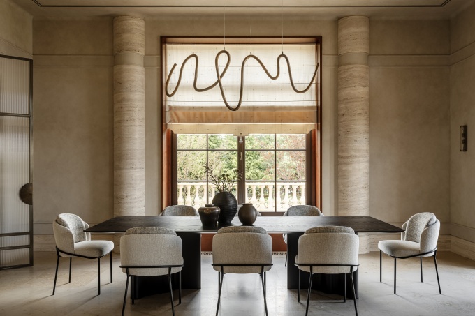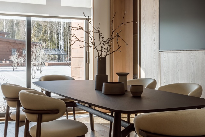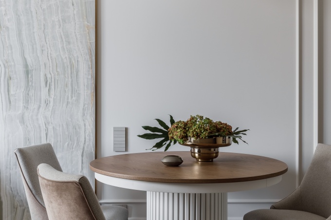 «Я не присутствовала на первой встрече, мне передали только запись разговора, - рассказывает архитектор. – В ней заказчица озвучила основные пожелания: связь интерьера с экстерьером, индивидуальная вневременная стилистка с отсылками к ар-деко, авторские, но без экстравагантности решения, нейтральная цветовая палитра с нюансной деталировкой и каменный пол в помещениях первого этажа. Сначала меня смущал камень, так как почти любой мрамор имеет активный рисунок и берет на себя много внимания. Но мне удалось найти идеальный вариант – юрский мрамор, у него абсолютно нейтральный цвет и сложная текстура с включением окаменелостей». В итоге именно камень задал основную линию: мягкие бежево-песочные оттенки и тактильные фактуры объединили весь интерьер. Благодаря такому решению все 1300 кв. м воспринимаются как единое цельное пространство, очень комфортное для проживания. Нейтральный цвет хорошо подчеркивает архитектуру и пластику стен и оттеняет цветовые акценты, раритетный винтаж и искусство.