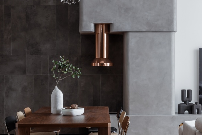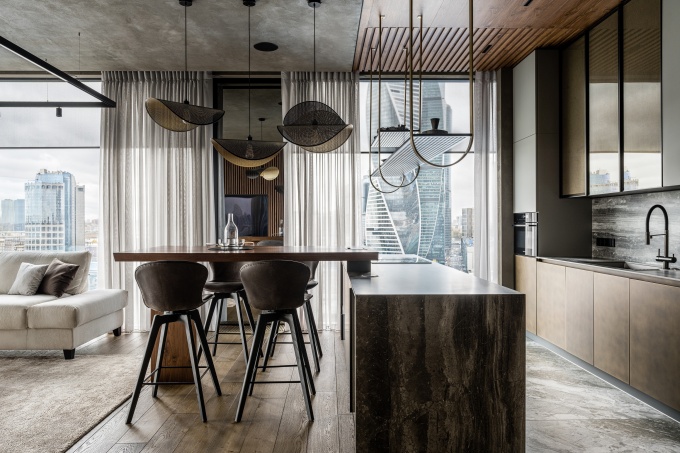 Она создала фактурный интерьер в темных тонах с элементами лофта, брутальными текстурами и акцентным авторским декором. Это насыщенное пространство эффектно контрастирует с цветом неба за окном и поддерживает урбанистическую городскую архитектуру.