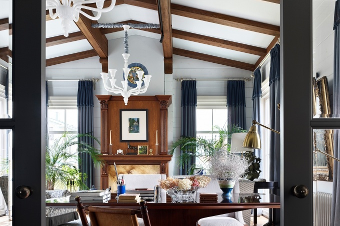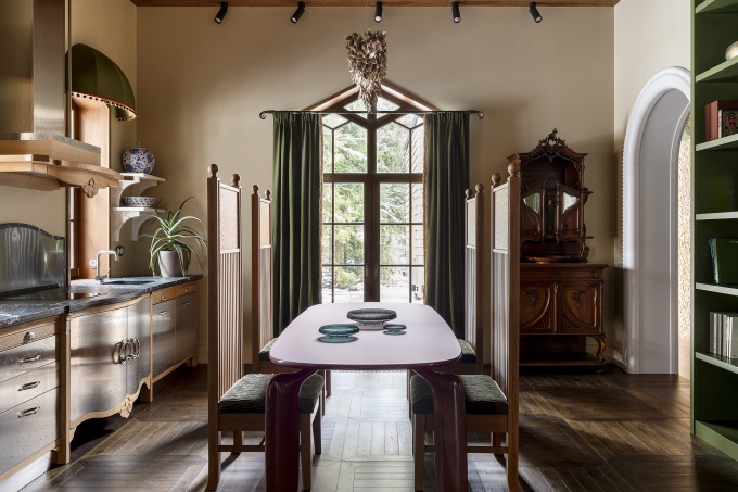 Чтобы не спорить с природой, дом решили построить одноэтажный, но с огромными окнами. Дизайнер признается, что на необычную форму оконных рам, ее вдохновил собственный дом Константина Мельникова в арбатских переулках. Но пытливый глаз найдет в интерьере оммажи и другим великим: от Фрэнка Ллойда Райта до Антонио Гауди и Уильма Моррриса.
