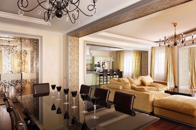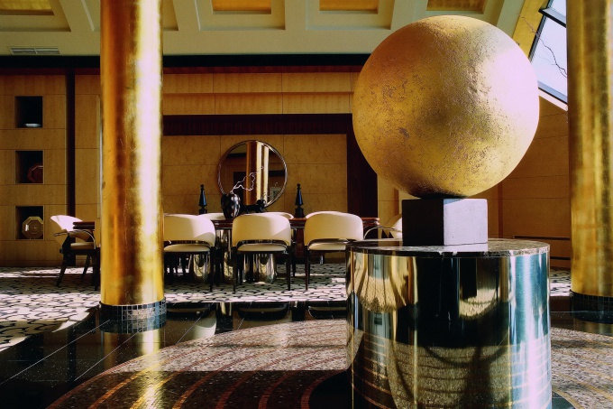 Точную копию сюжета мобильной декоративной панели «Оазис» авторы проекта использовали на декоративном портале в двух проемах гостиной. По периметру потолка всей общественной зоны они пустили золотой фриз, напоминающий все ту же знаковую работу эпохи ар-деко.