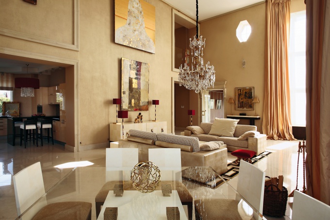 Здесь есть и лепнина, и авторский камин, и абсолютно современные вещи: продвинутая аудиотехника, оборудование кухни.