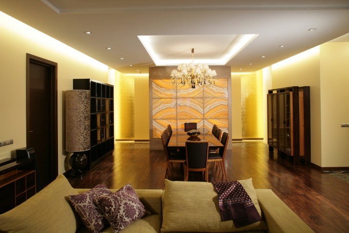 Архитекторы предложили современный интерьер с обилием света и воздуха, перетекающими пространствами, теплой цветовой гаммой и яркими акцентами в виде натурального оникса и сусального золота.