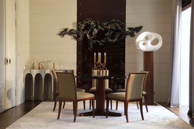 Авторы проекта оставили многообразие фактур отделки, дорогие породы дерева, мрамор, кожу, лепные потолочные карнизы, но смягчили отделку стен и подобрали более простую по дизайну мебель.