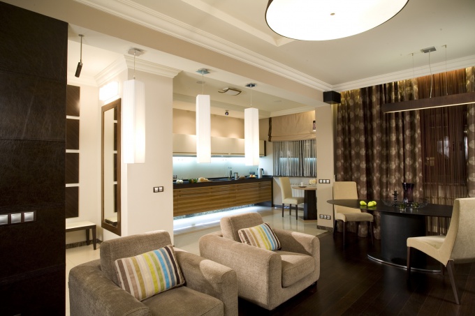 Интерьер квартиры для мужчины с сыном-студентом решен в современной стилистике с лаконичным декором. Первоначально архитекторы предложили вариант оформления в духе ар-деко, но в процессе работы над проектом было решено оставить только его элементы, взяв за основу современную, более демократичную стилистику.