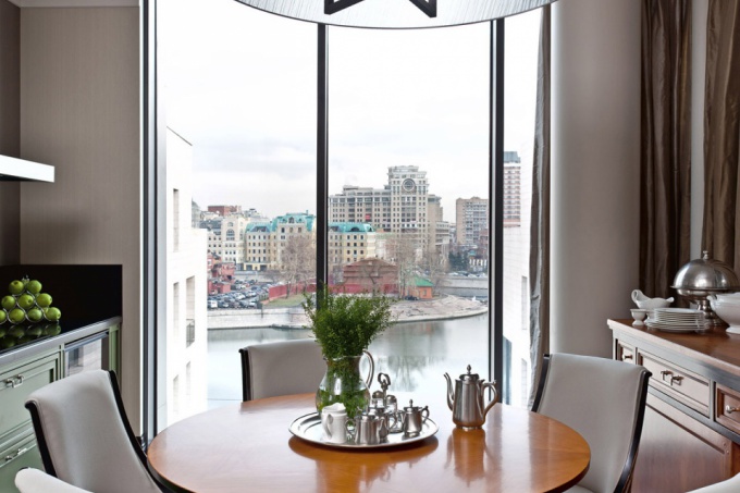 Квартира с панорамными окнами и прекрасным видом на Москву оформлена в современном стиле с элементами ар-деко. Она сдавалась в свободной планировке, без несущих стен, планировка была обозначена лишь несущими колоннами.