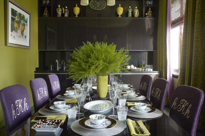Оттенки спелого лайма, свежей зелени, сирени, брусники и коралла стали лейтмотивом проекта и пришлись по вкусу позитивным и открытым миру владельцам. Специально для проекта были разработаны предметы мебели, отреставрированы антикварные и винтажные предметы, а также собрана впечатляющая коллекция работ знаменитых художников ХХ века.