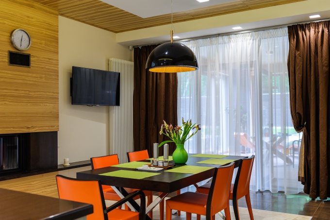 Жилые пространства расположены в глубине участка. Они, как и открытая веранда, обособлены от посторонних глаз. Важную роль в атмосфере дома играют окна. Несмотря на панорамное остекление гостиная была закрыта от солнца выступающими частями кровли и сохраненными столетними деревьями. Архитектор предложила прорезать кровлю и разместить дополнительные окна – мансардные, а, чтобы солнечный свет ничто не перекрывало, был выбран светильник из прозрачного стекла. В итоге общая зона получилась необычайно светлой и солнечной.