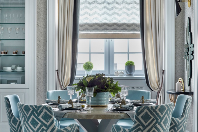 Для молодой семейной пары с ребенком дизайнер Варвара Шабельникова создала эклектичную квартиру в прохладных жемчужно-бирюзовых тонах. Интерьер необычайно свежий, легкий и воздушный. Важное внимание она уделила подбору обивочных и драпировочных тканей, их цветовой палитре и орнаменту.