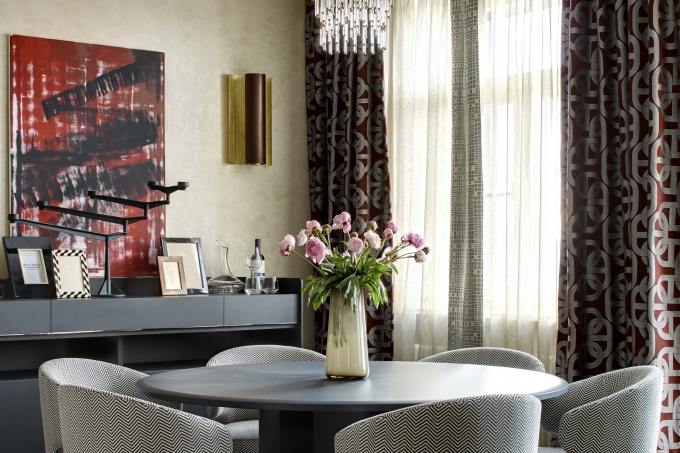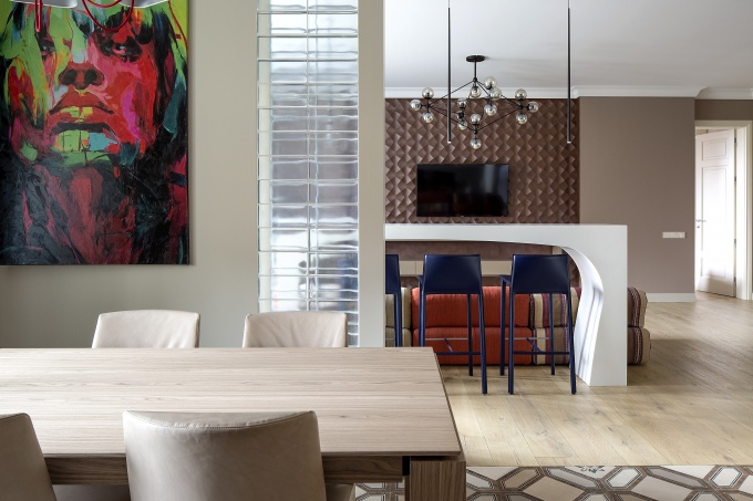 Архитектор Наталья Зеленова спроектировала эклектичную квартиру площадью 160 кв. метров для семьи из трех человек: родителей и их взрослой дочери. Квартира расположена в новом жилом комплексе и имеет сложную конфигурацию: часть помещений выходит на угловую секцию дома, расположенную под углом к основному фасаду, и имеет неправильную форму.