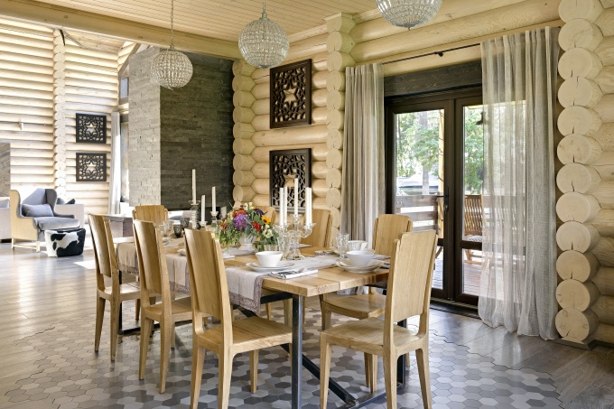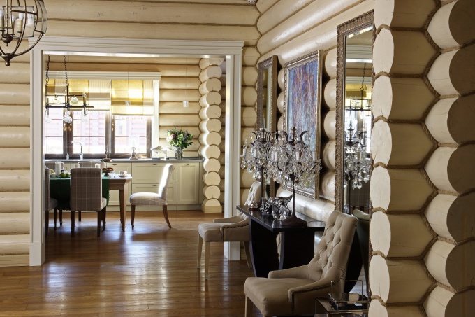 Хозяева дома площадью 400 кв. метров из оцилиндрованного бревна обратились к дизайнеру Наталии Вологдиной-Аникиной с пожеланием создать роскошный интерьер с классической линией, пышным декором, камнем и панелированием. Автор проекта предложила сохранить парадный настрой, но вывести на первый план природную фактуру открытой бревенчатой кладки.