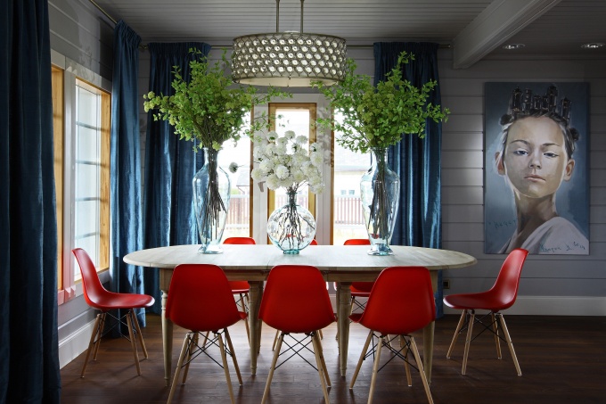 При разработке дизайн-проекта заказчики поставили задачу уйти от идеи деревянного дачного домика, привнести в интерьер современную ноту, но при этом сохранить ощущение связи поколений.