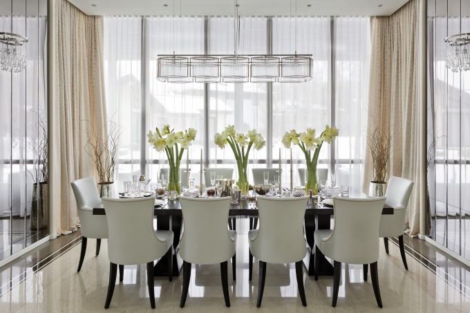 Архитектор Олег Клодт создал дом для нескольких поколений семьи, наполнил его рукотворными изделиями и создал атмосферу элегантного неоклассического интерьера в жемчужно-серебристых тонах. Интерьер решен в легкой изысканной манере и светлой, почти белой гамме, за счет нюансов цветов и фактур он сияет как перламутр.