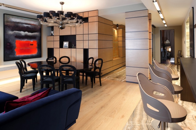 Заказчики уже некоторое время жили в классическом интерьере и свою новую квартиру они видели современной, динамичной, цветной, с яркой эмоциональностью. О минимализме речи и не могло быть, поэтому авторы проекта сделали основную ставку на пластику пространства, а также теплую фактуру дерева, природного оникса, текстиль насыщенных цветов. На стилистку интерьера во многом повлияла коллекция современная искусства, которую заказчики собирали долгие годы.