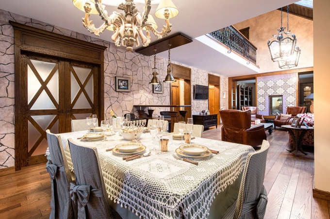 Стилистику интерьеров во многом определил экстерьер дома: лаконичная вытянутая по ландшафту двухэтажная постройка, облицованная светло-бежевым литьевым камнем и оформленная декоративными элементами. Плоскую кровлю авторы проекта обыграли с помощью фронтона с лепным медальоном, входную группу акцентировали колоннами с резными капителями, высоту подчеркнули с помощью широкого карниза, пущенного по периметру. Изящные кованые ограждения усилили ощущение парадного родового поместья.