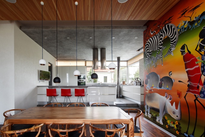 Для заказчика – знатока африканской культуры и коллекционера африканских артефактов – архитекторы Роман Леонидов и Анастасия Леонидова спроектировали и оформили дом, наполненный атмосферой и красками знойного континента. Сам дом с простой лаконичной архитектурой построен в модернистском ключе. Набранный из нескольких объемов трехэтажный Г-образный особняк с большой открытой террасой напоминает гигантский скульптурный объект, где каждый его элемент подчинен определенной функции и точно вписан в ландшафт.