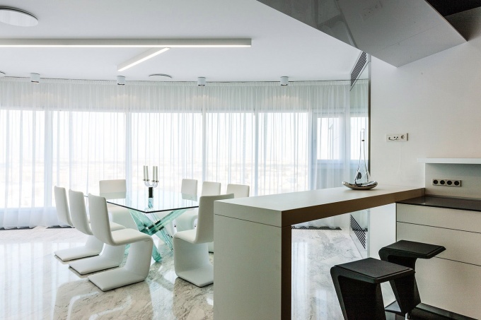 В современном высотном жилом комплексе архитекторы оформили квартиру, в которой панорамный вид на центр Санкт-Петербурга является полноправной частью интерьера. Молодой человек обратился с пожеланием оформить квартиру площадью 220 кв. м в современном динамичном стиле, с перетекающими пространствами и нетривиальными решениями.